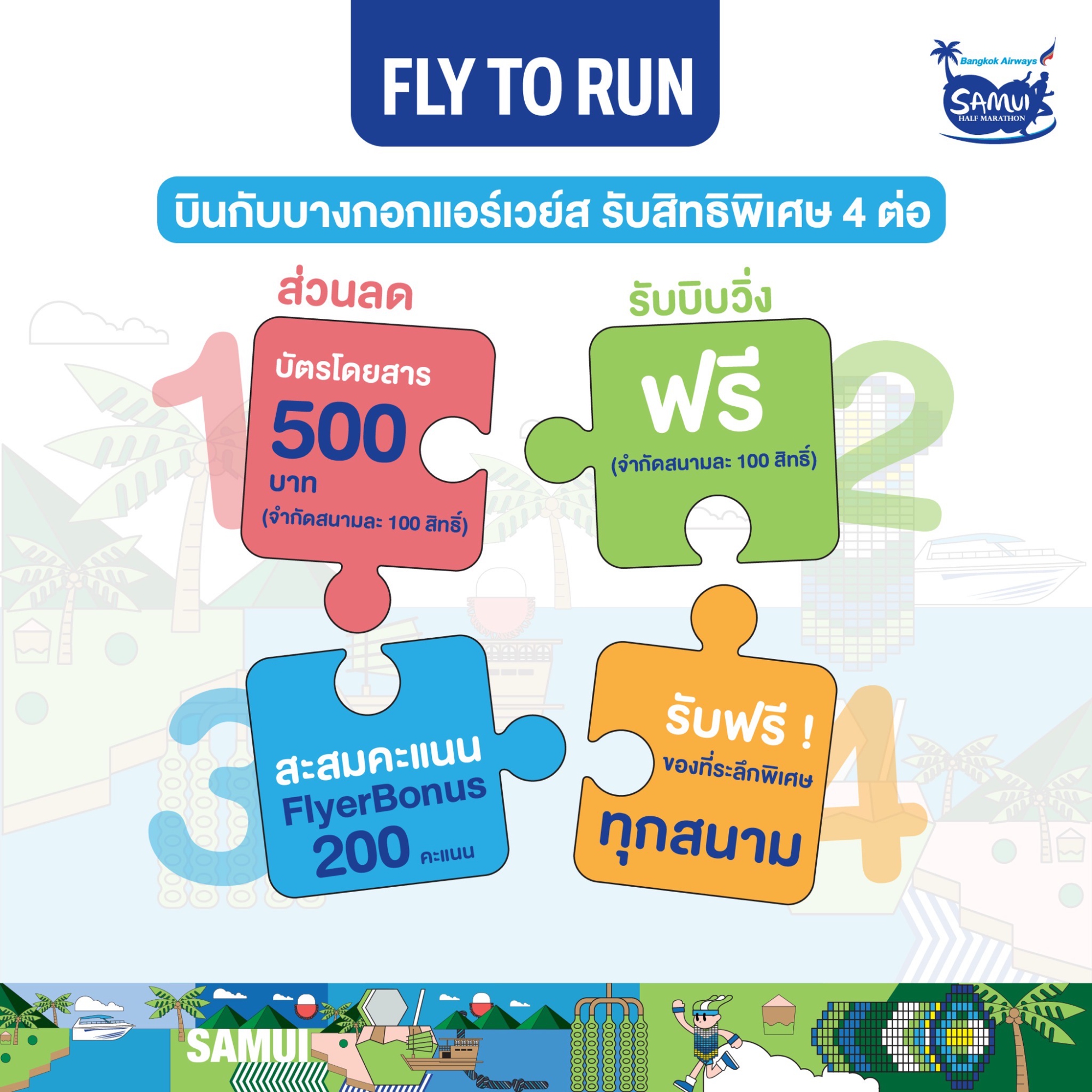 ต่อที่ 1 : นักวิ่ง*รับโค้ดส่วนลดบัตรโดยสารของสายการบินบางกอกแอร์เวย์สมูลค่า 500 บาท/ท่าน สำหรับการสำรองที่นั่งบัตรโดยสารเครื่องบินไป-กลับ ในเส้นทางสมุย ภายในระยะเวลาที่กำหนดเท่านั้น (จำกัด 100 สิทธิ์ ต่อสนาม)