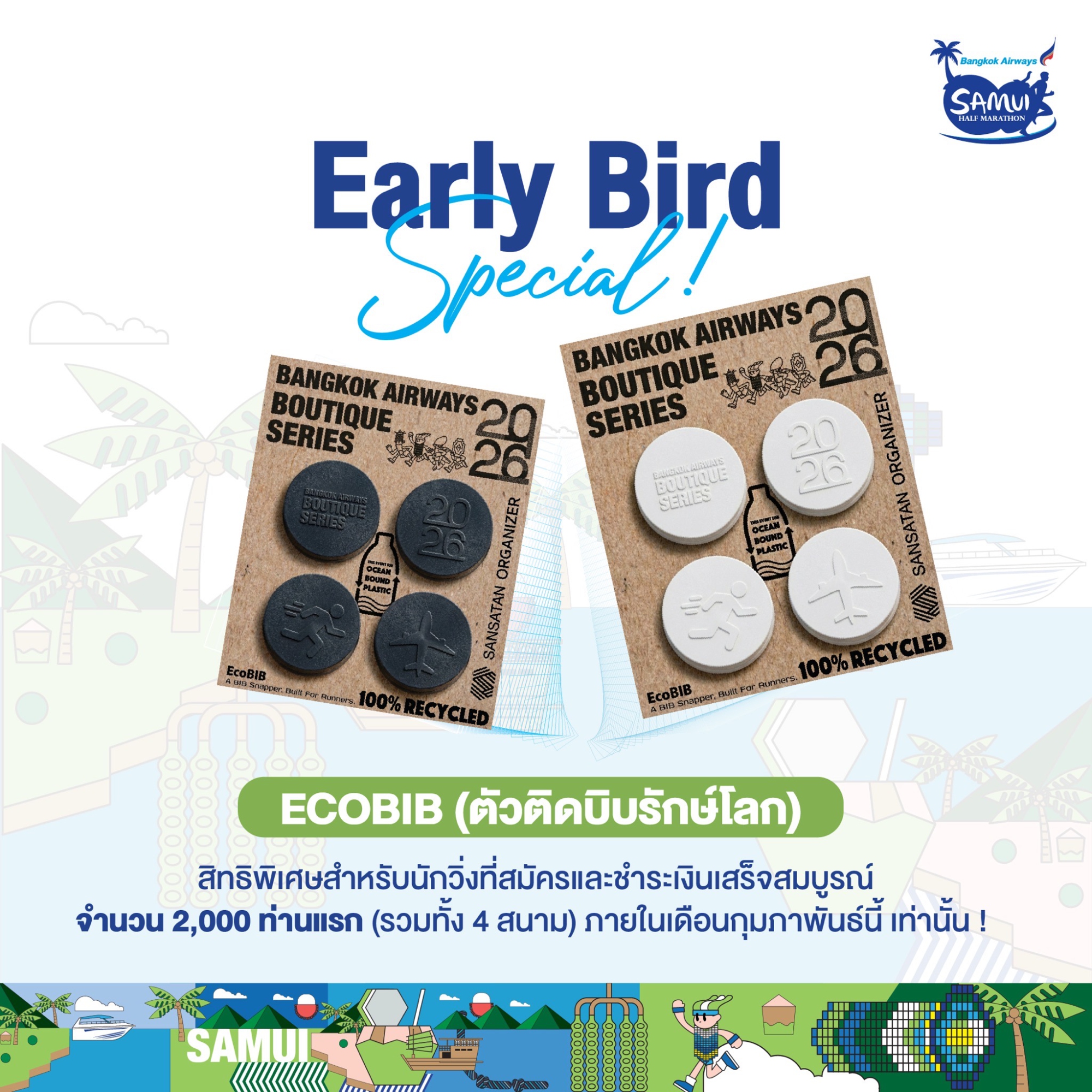 รับฟรี! "EcoBIB Snapper" ของขวัญสุด Exclusive สำหรับนักวิ่ง 2,000 ท่านแรก (รวมทั้ง 4 สนาม) ที่สมัครร่วมรายการ Bangkok Airways Boutique Series 2026 ภายในเดือนกุมภาพันธ์นี้เท่านั้น! เฉพาะผู้สมัครแบบชำระเงินปกติ ไม่สามารถใช้ร่วมกับโปรโมชันส่งเสริมการขายอื่นๆ หรือสิทธิ์วิ่งฟรีทุกกรณี