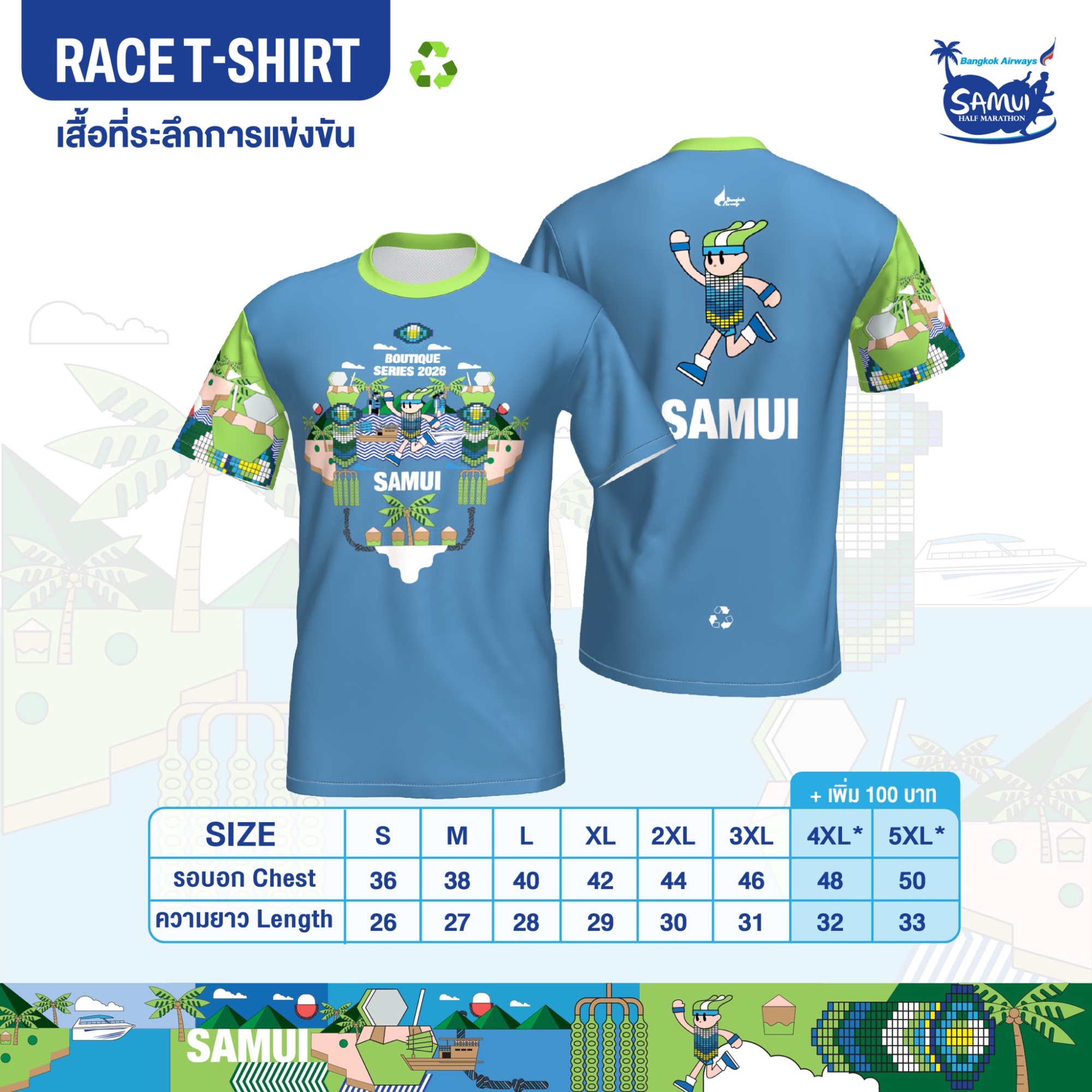 พร้อมพาทุกคนออกไปวิ่งกับคอลเลคชั่นเสื้อวิ่งดีไซน์ล่าสุดที่หยิบเอาอัตลักษณ์ของ สมุย มาถ่ายทอดเป็นลวดลายสุดยูนีคบนผืนผ้า นอกจากดีไซน์ที่สวยงามโดดเด่นและการสวมใส่ที่สบายระบายอากาศได้ดีแล้ว เสื้อวิ่ง 1 ตัวยังใช้เส้นใยพลาสติกรีไซเคิลเทียบเท่าขวดน้ำ 20 ขวด ซึ่งช่วยลดขยะและดูแลโลกไปพร้อมกับทุกก้าวของคุณบนเส้นทางสายบูทีค