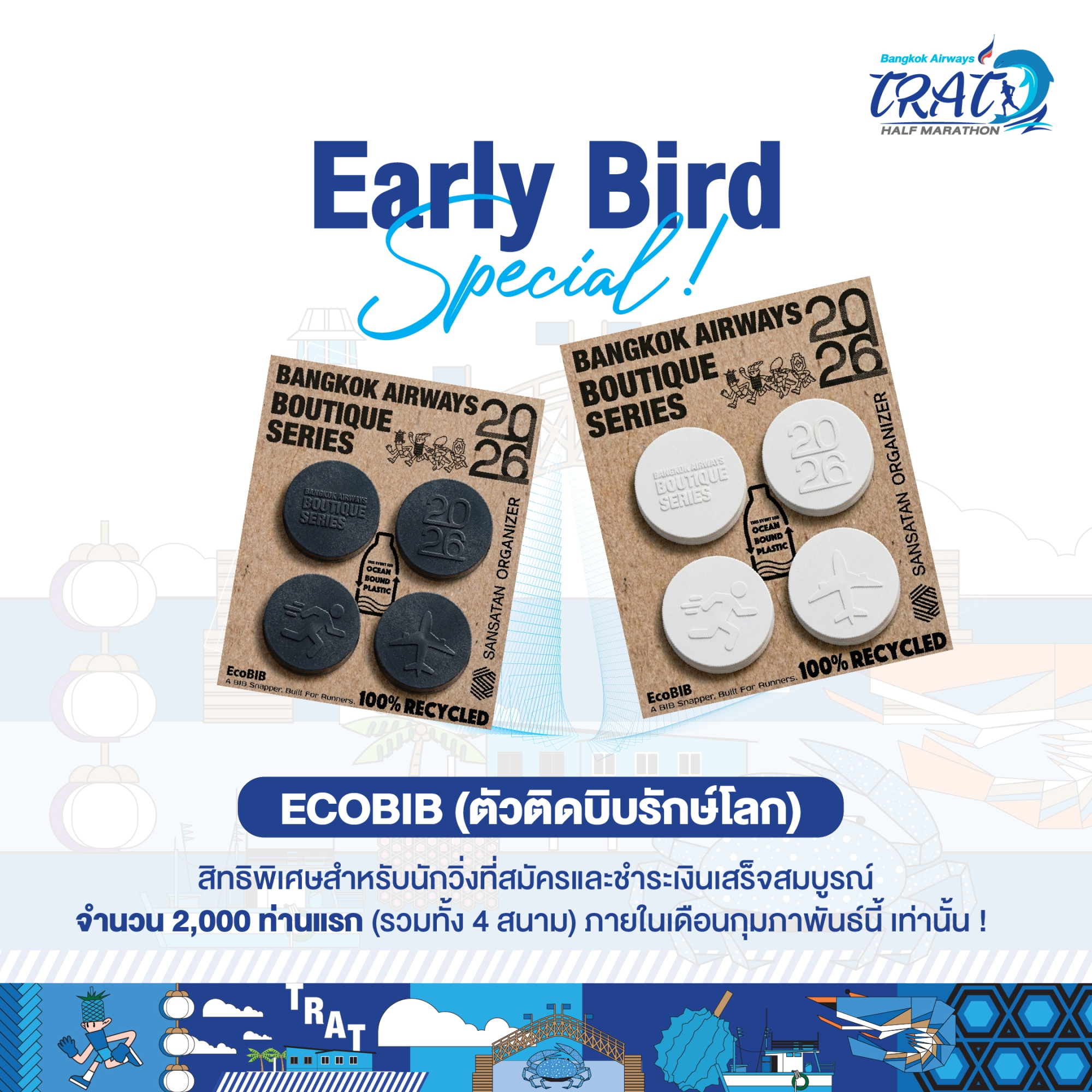 รับฟรี! "EcoBIB Snapper" ของขวัญสุด Exclusive สำหรับนักวิ่ง 2,000 ท่านแรก (รวมทั้ง 4 สนาม) ที่สมัครร่วมรายการ Bangkok Airways Boutique Series 2026 ภายในเดือนกุมภาพันธ์นี้เท่านั้น! เฉพาะผู้สมัครแบบชำระเงินปกติ ไม่สามารถใช้ร่วมกับโปรโมชันส่งเสริมการขายอื่นๆ หรือสิทธิ์วิ่งฟรีทุกกรณี