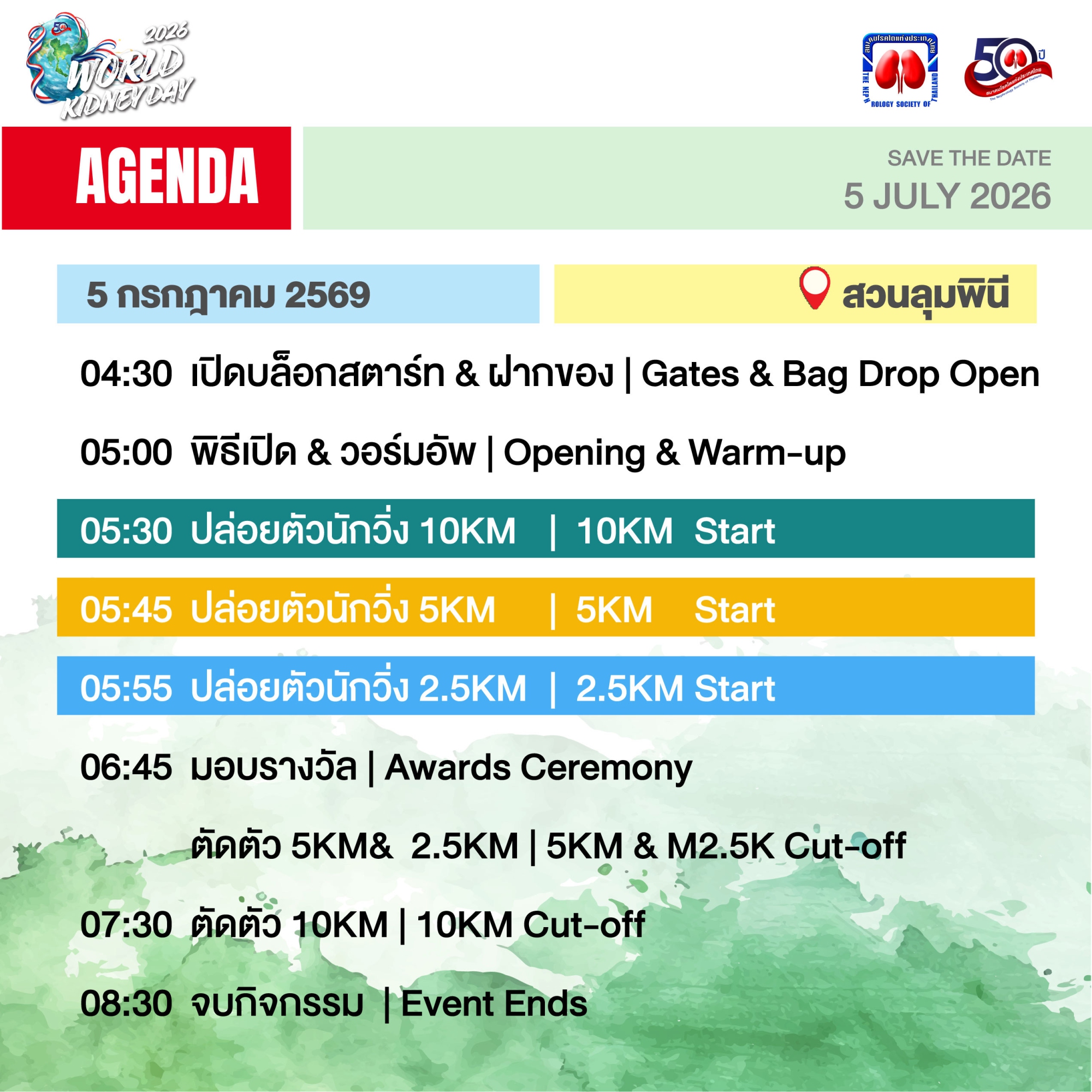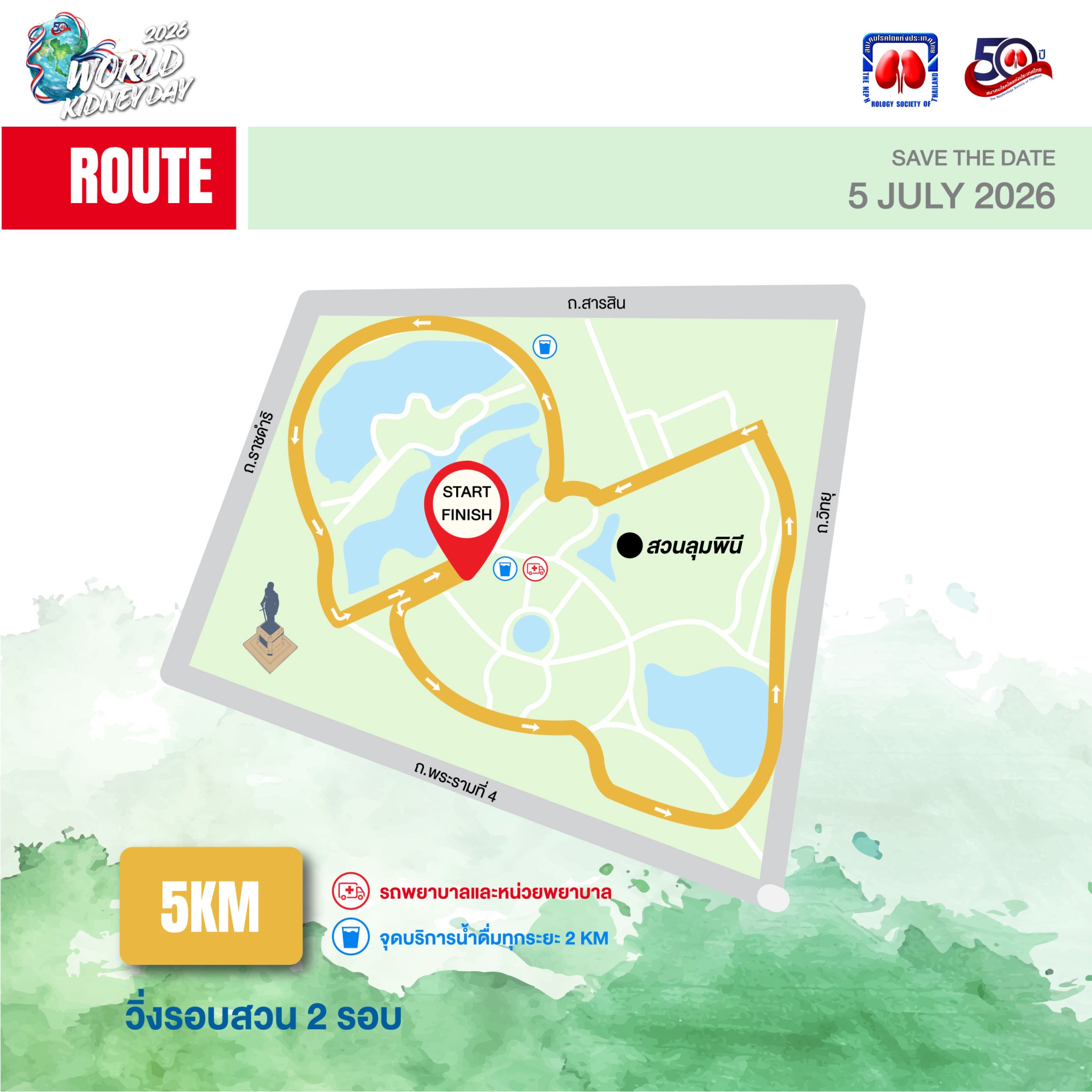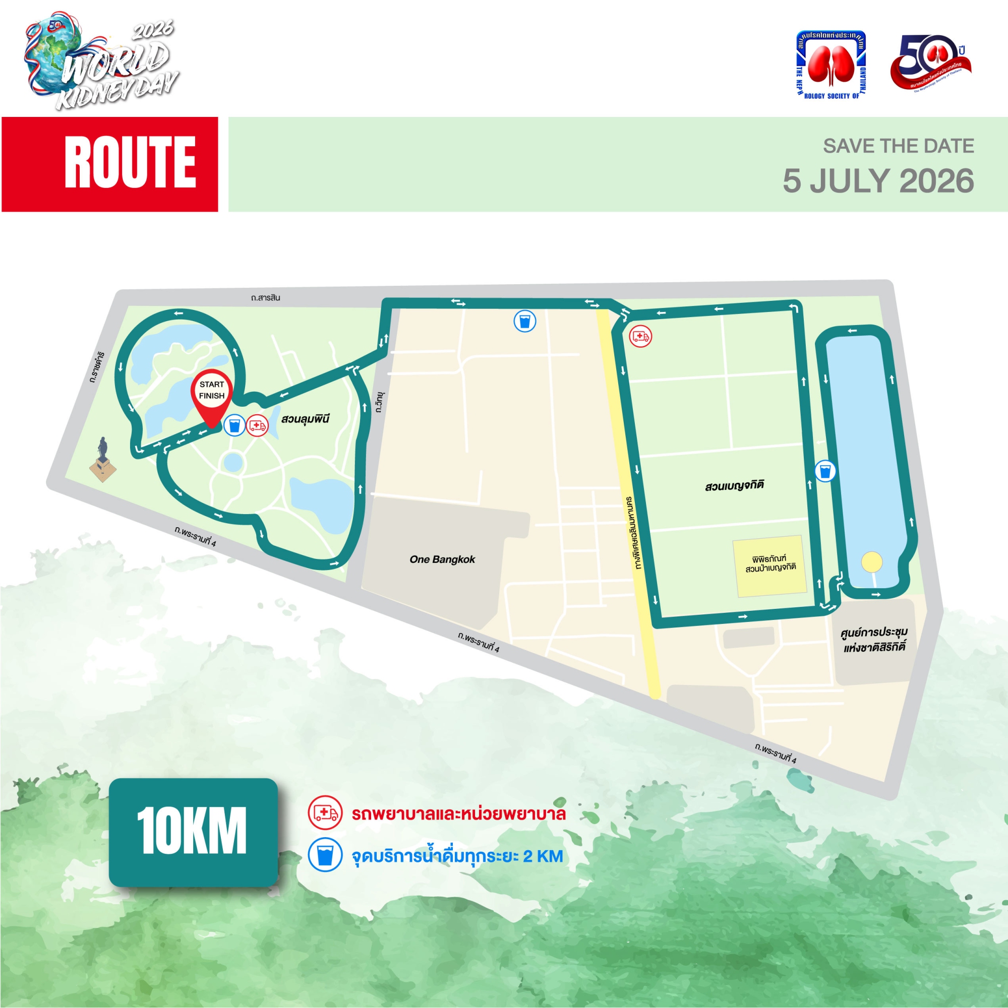 ขอเชิญชวนเหล่านักวิ่งและผู้รักสุขภาพร่วมเป็นส่วนหนึ่งของเหตุการณ์ครั้งสำคัญ ในวาระครบรอบ 50 ปี การก่อตั้งสมาคมโรคไตแห่งประเทศไทย เนื่องในวันไตโลก (World Kidney Day) ประจำปี 2569 มาร่วมสร้างประวัติศาสตร์แห่งการแบ่งปันและตระหนักถึงการป้องกันโรคไตและโรคไม่ติดต่อเรื้อรังบนเส้นทางสีเขียวใจกลางเมือง