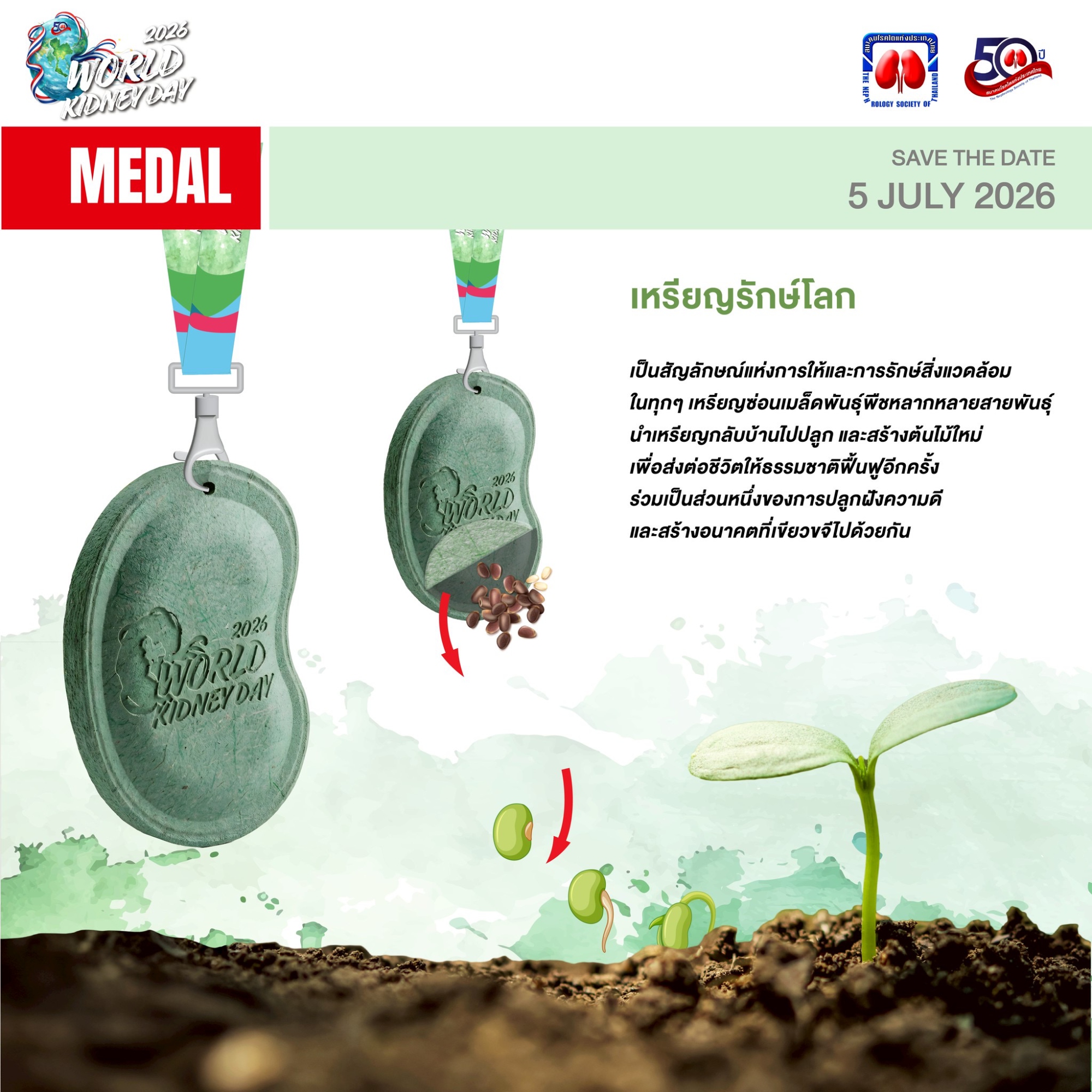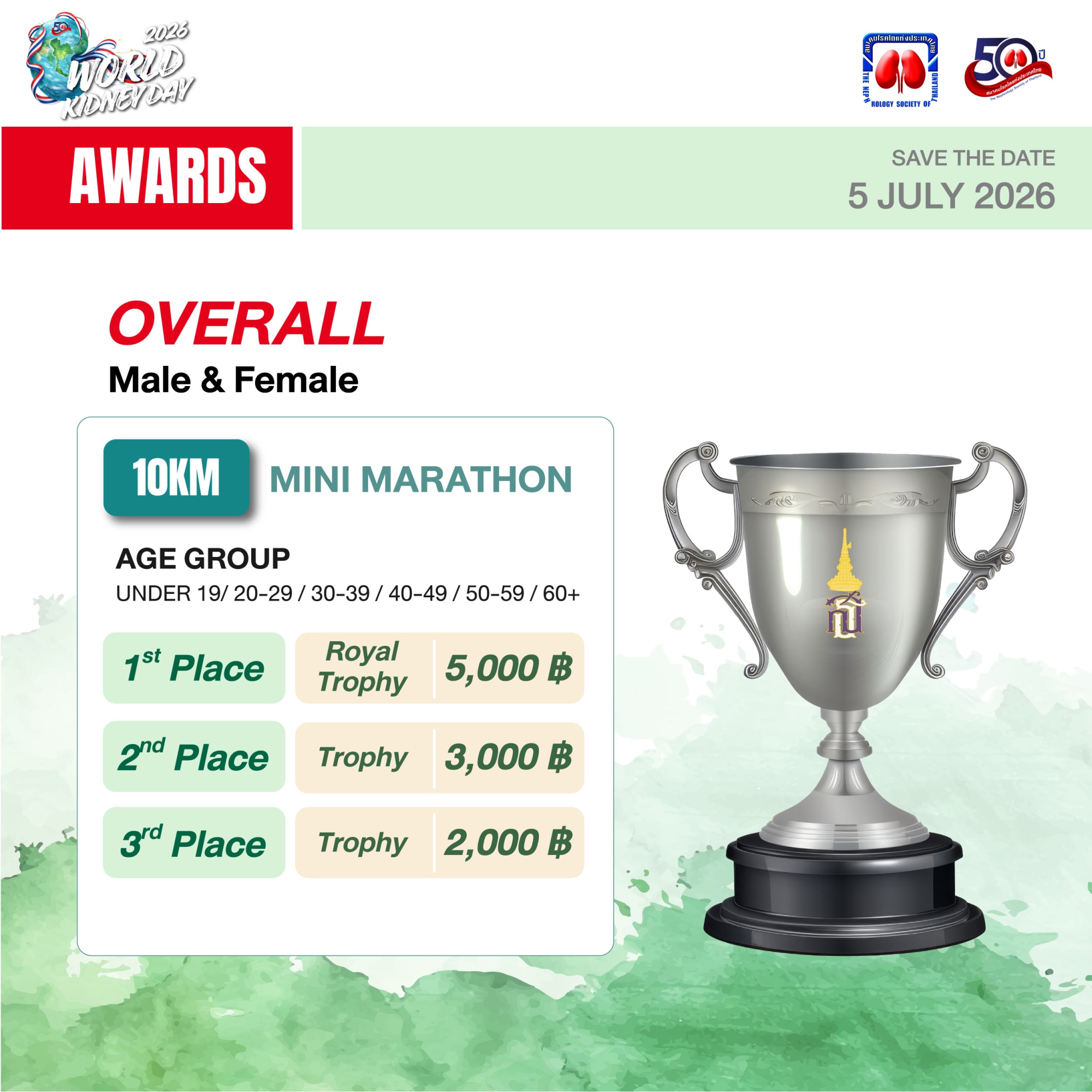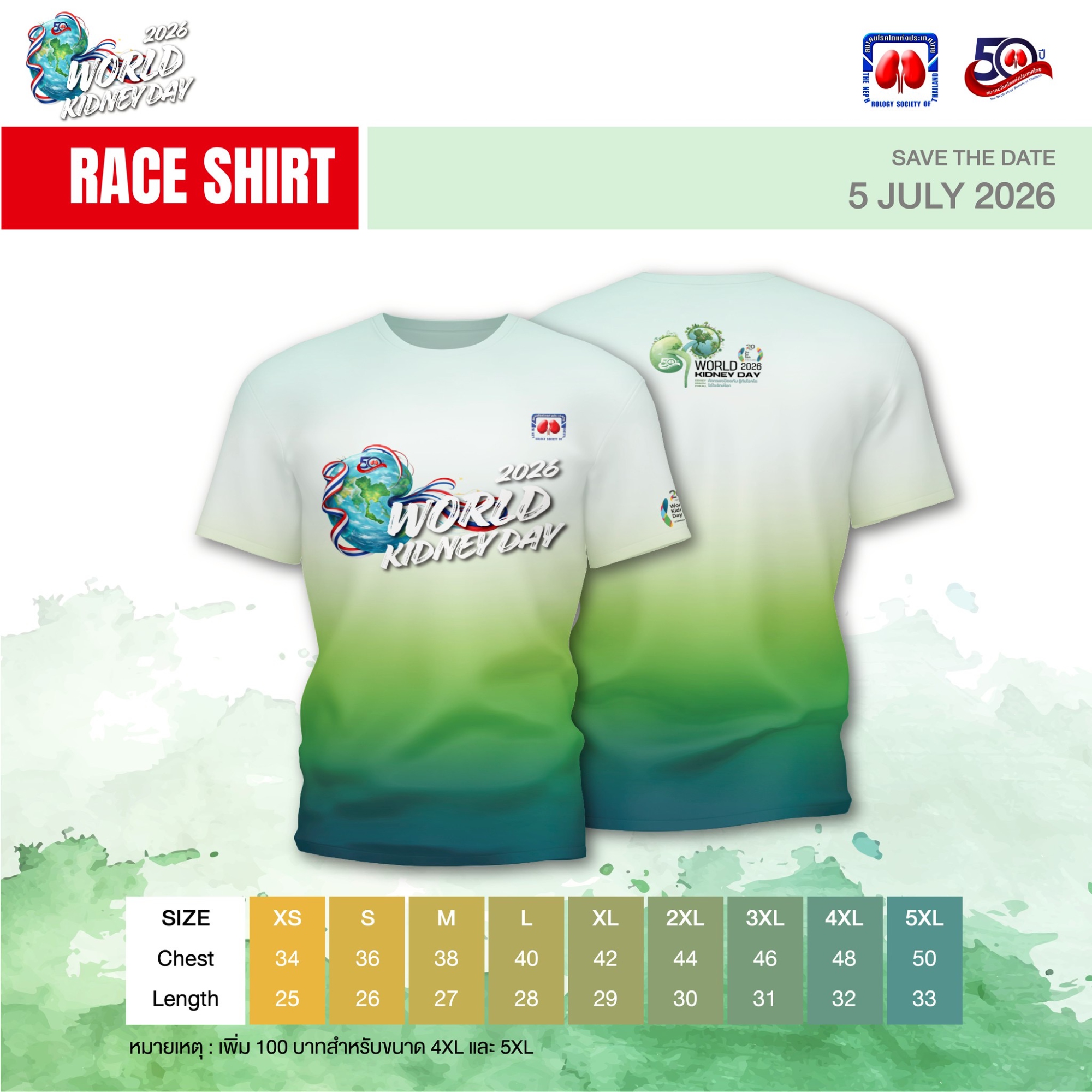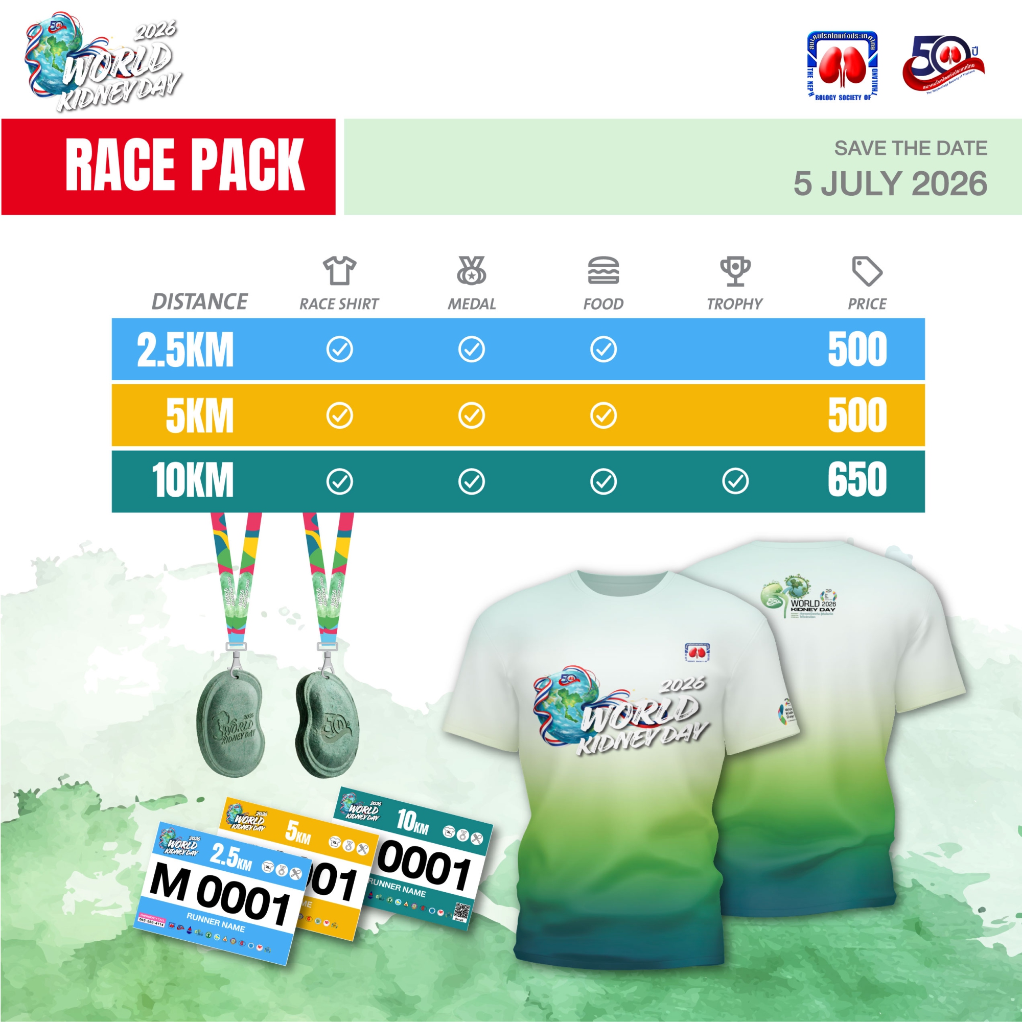 ขอเชิญชวนเหล่านักวิ่งและผู้รักสุขภาพร่วมเป็นส่วนหนึ่งของเหตุการณ์ครั้งสำคัญ ในวาระครบรอบ 50 ปี การก่อตั้งสมาคมโรคไตแห่งประเทศไทย เนื่องในวันไตโลก (World Kidney Day) ประจำปี 2569 มาร่วมสร้างประวัติศาสตร์แห่งการแบ่งปันและตระหนักถึงการป้องกันโรคไตและโรคไม่ติดต่อเรื้อรังบนเส้นทางสีเขียวใจกลางเมือง