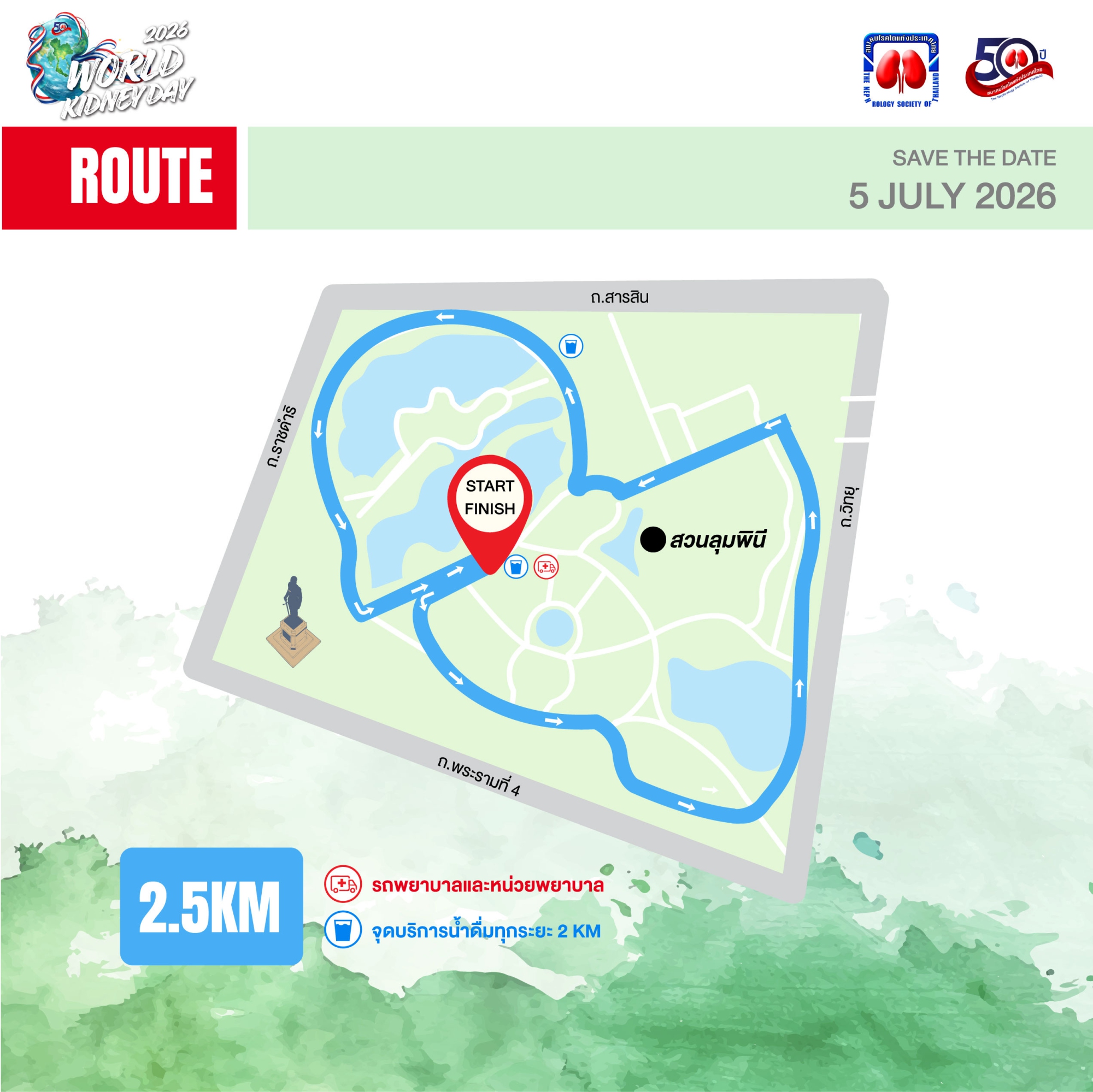 สัมผัสเส้นทางสุดพิเศษใจกลางเมือง เริ่มต้นปล่อยตัวที่สวนลุมพินี วิ่งรับลมบน สะพานเขียว แลนด์มาร์คสุดชิคเชื่อมต่อไปยังสวนเบญจกิติ เพลิดเพลินกับวิวเมืองและพื้นที่สีเขียวตลอดเส้นทาง มาวิ่งเพื่อตัวคุณเองและส่งต่อพลังใจให้ผู้ป่วยโรคไตด้วยกัน สำหรับระยะ ระยะ 5KM และ 2.5KM เดิน-วิ่งชมความร่มรื่นอยู่ภายในสวนลุมพินี